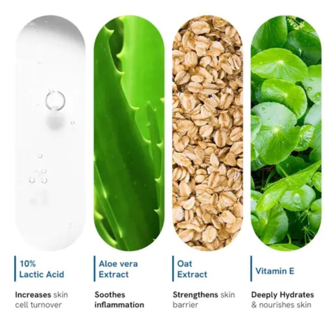 – Dual Exfoliation: The blend of AHA (lactic acid) and physical scrub particles reduces rough texture and uneven tone.
