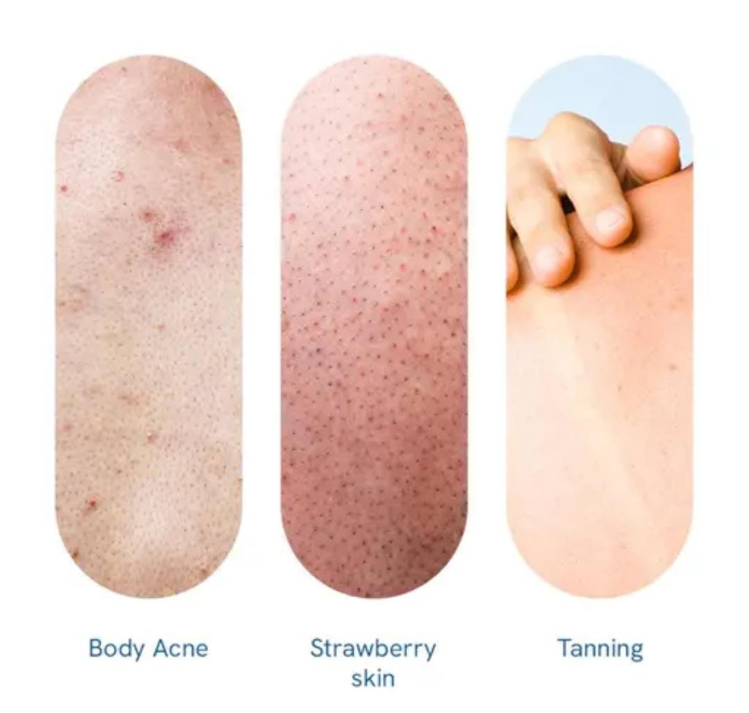 – Strawberry Skin Reduction: Targets keratosis pilaris (“strawberry skin”) by unclogging pores and smoothing bumps.