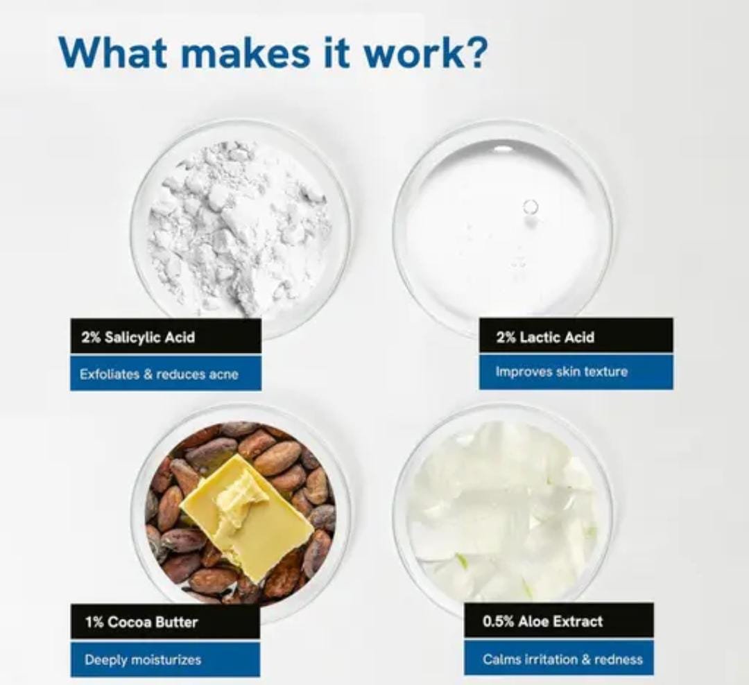 It combines exfoliation (AHA & BHA) with moisturization (shea & cocoa butter).