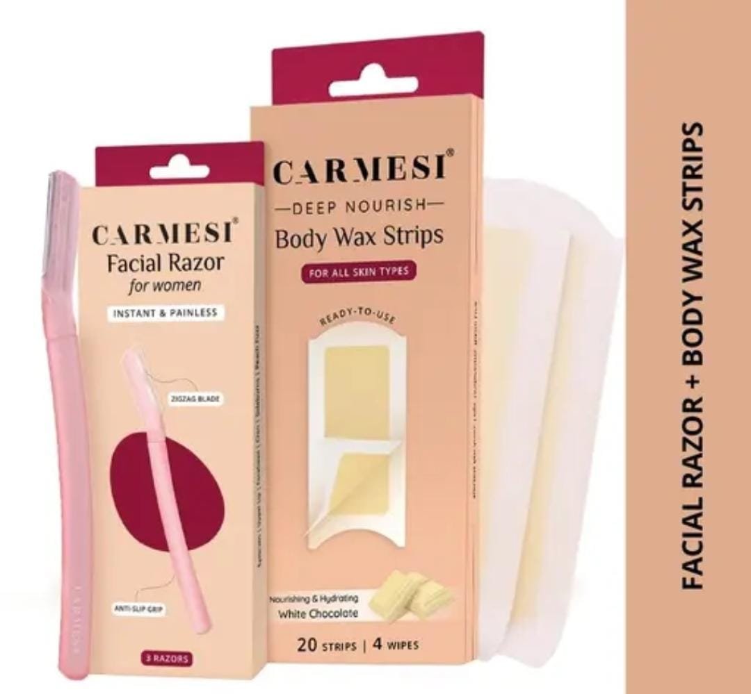 Experience salon-like grooming at home with the Carmesi Hair Removal Combo, featuring the Carmesi Face Razor Pack of 3, Carmesi Deep Nourish Body Wax Strips (20 strips), and 4 Post-Wax Wipes. This all-in-one kit is designed to deliver smooth, painless hair removal while nourishing and caring for your skin.