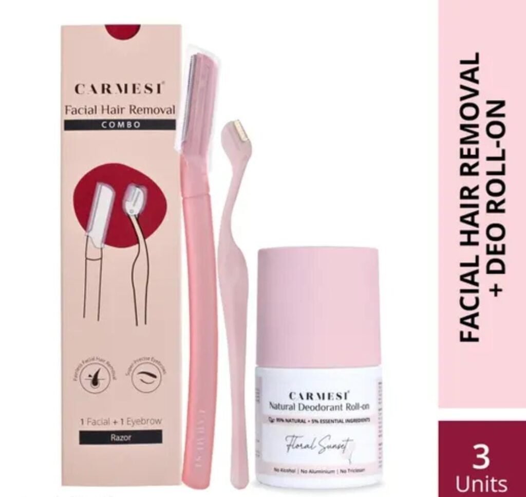 Simplify your grooming routine with the Carmesi Facial Hair Removal Combo, featuring a Facial + Eyebrow Razor and the Carmesi Underarm Roll-On Deodorant for Women – Floral Sunset (50ml). This dual-care pack combines instant, painless hair removal with all-day underarm freshness, making it a must-have for modern women seeking convenience and confidence.