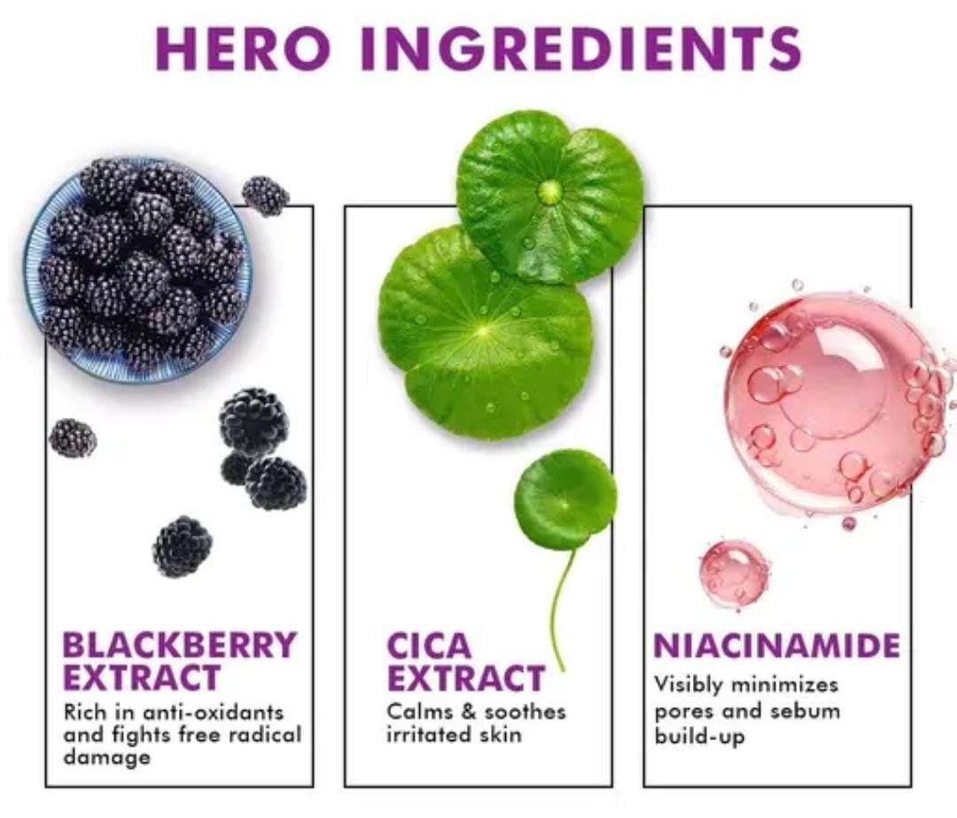 – Active Ingredients: Niacinamide & Berry Extracts.
