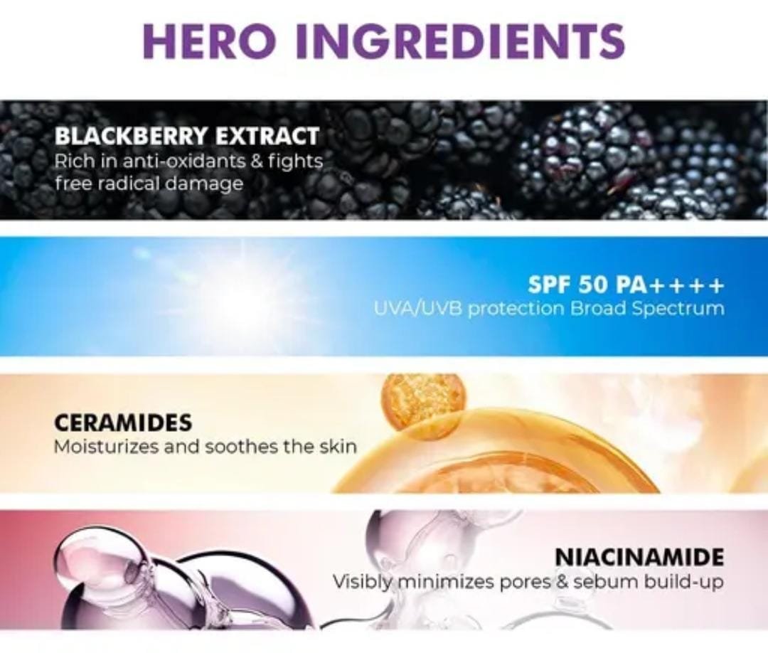 Its hybrid formula with SPF 50 PA++++, enriched with niacinamide and antioxidant-rich blackberry extract.