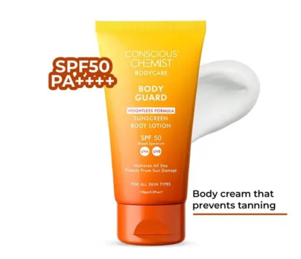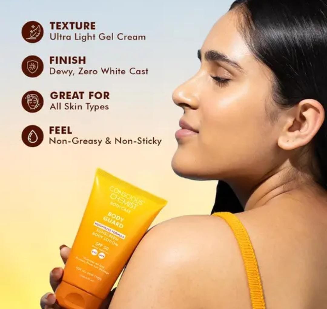 Shield and refresh your skin with the Conscious Chemist Body Sunscreen SPF 50 (150g). This advanced body lotion is designed to provide broad-spectrum UVA & UVB protection while delivering instant cooling relief and de-tanning benefits. Enriched with niacinamide and ceramides, it not only protects against sun damage but also helps reduce dark spots, restore hydration, and strengthen the skin barrier.