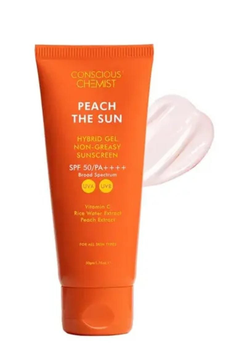 Brighten and protect your skin with Conscious Chemist Peach The Sun Sunscreen SPF 50 PA++++ (50g), a modern mineral-meets-active sunscreen designed for all skin types. Offering broad-spectrum UVA/UVB protection, this sunscreen shields against sunburn, tanning, and premature aging while delivering antioxidant-rich care.