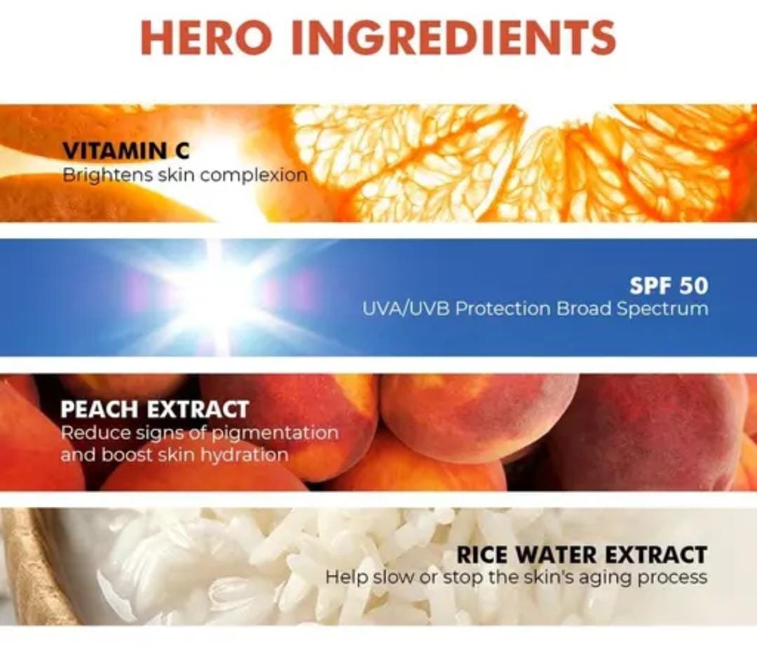 It combines SPF 50 PA++++ protection with Vitamin C for brightening and antioxidant care.