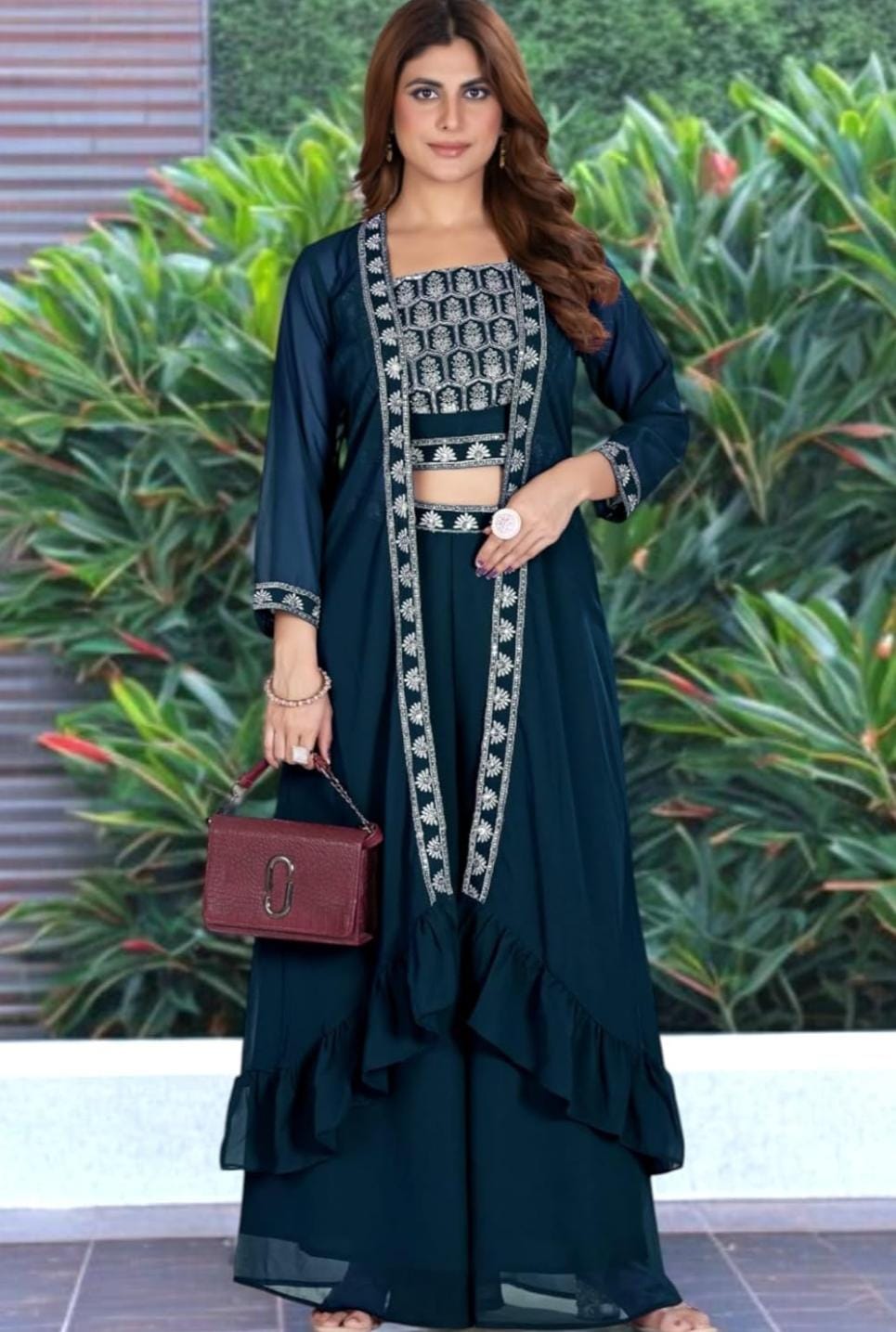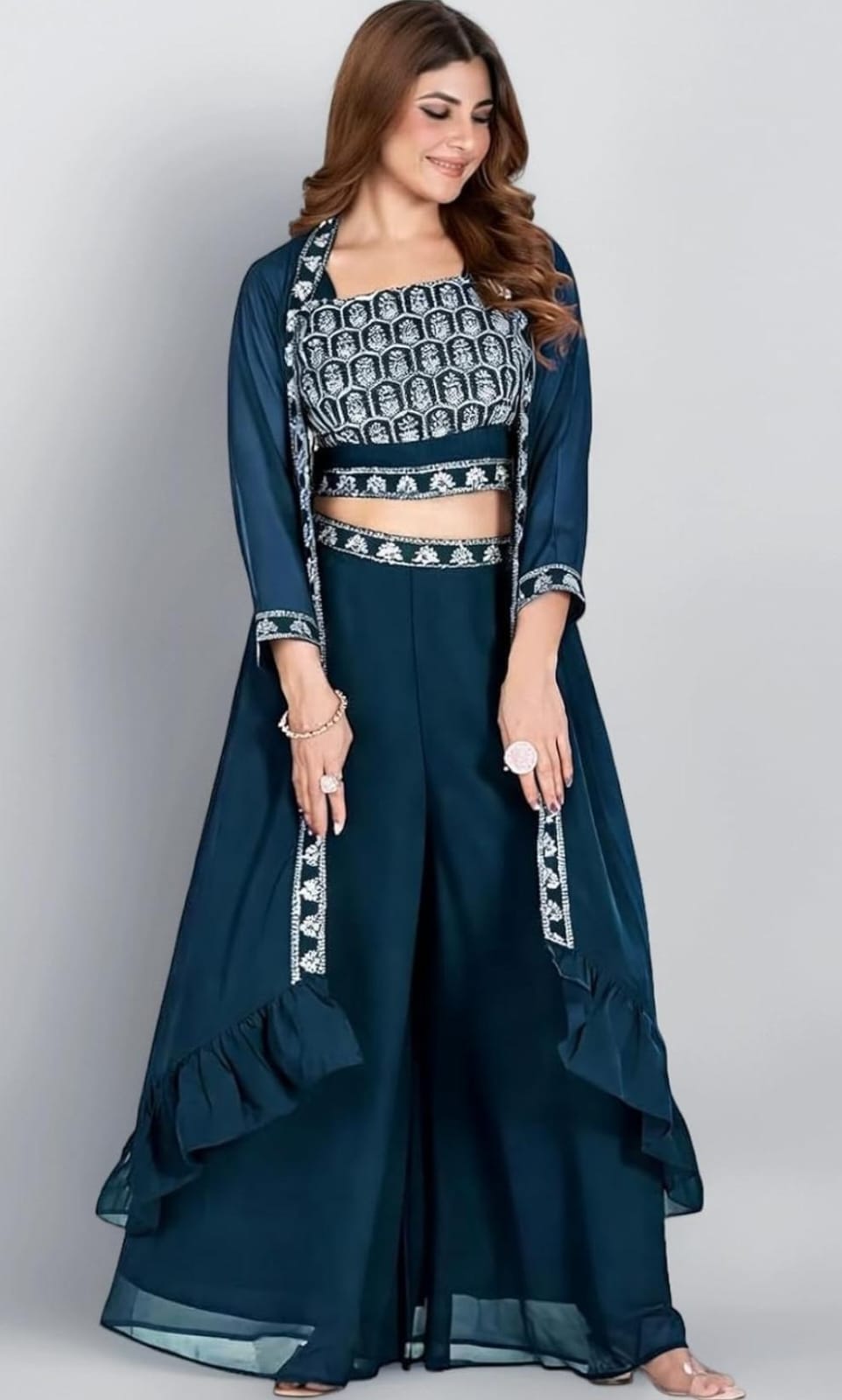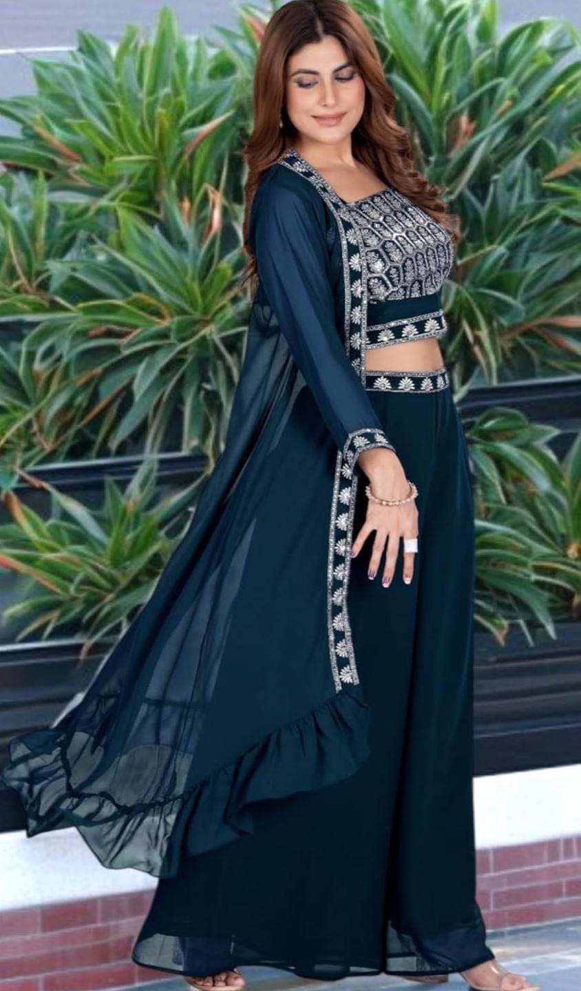 This beautifully designed Indo-Western palazzo set is a perfect blend of traditional Indian elegance and modern fashion. Created for women who appreciate contemporary ethnic style, this outfit combines comfort, sophistication and festive charm. The set includes a stylish crop top, comfortable palazzo pants and a long jacket that adds a graceful layered look to the entire outfit.