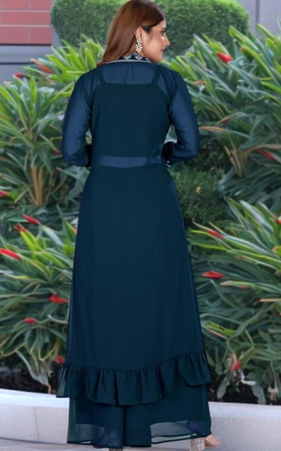 The Indo-Western palazzo set is also an excellent choice for international buyers who appreciate Indian ethnic fashion. Indian embroidered outfits are widely admired across the world for their craftsmanship and cultural heritage. This outfit reflects that tradition while offering a modern silhouette that suits contemporary fashion preferences.