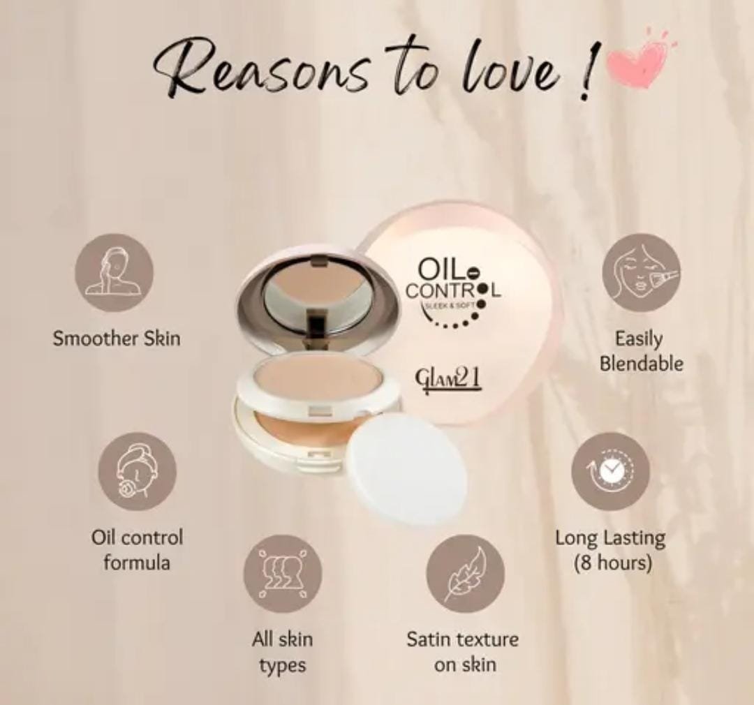 Stay fresh and flawless all day with the Glam21 Oil Control Sleek & Soft 2-in-1 Compact Powder (Vanilla 01, 20g). Specially formulated to control excess oil and deliver a smooth matte finish, this compact powder doubles as a setting powder and light foundation, making it a versatile essential for everyday wear.