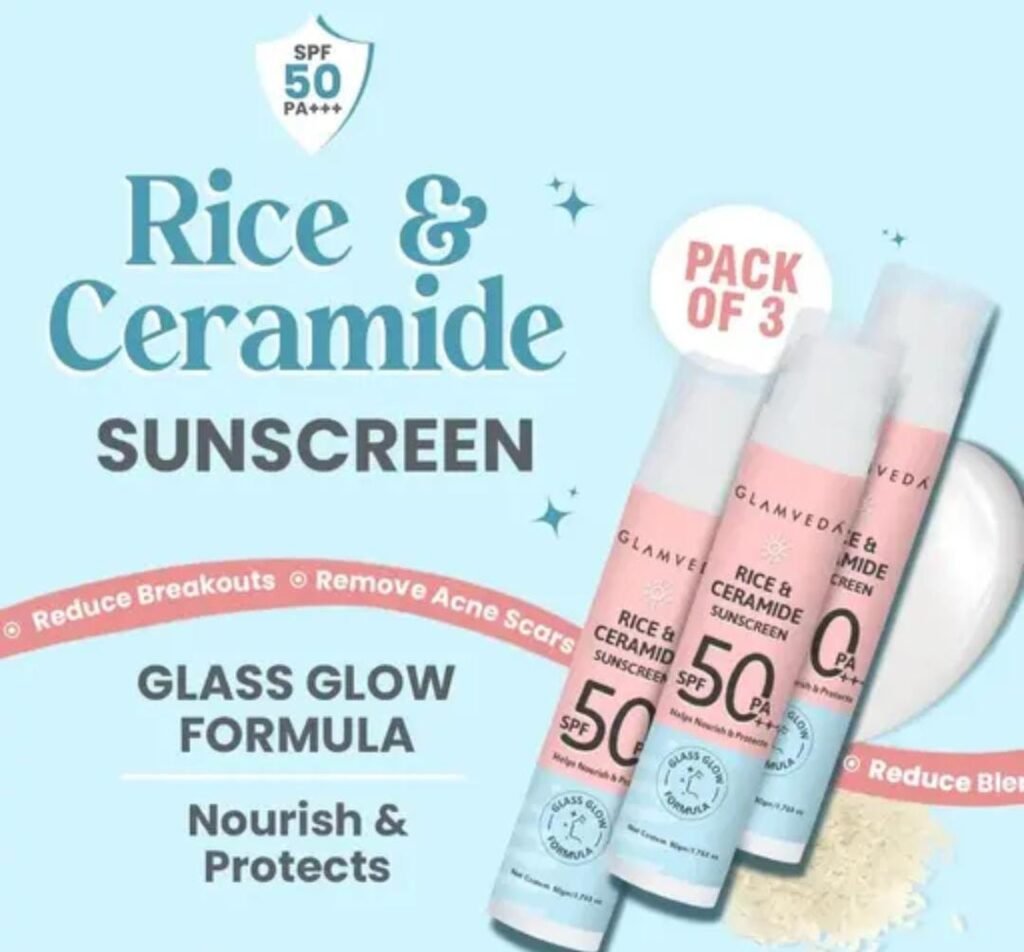 Elevate your skincare routine with the Glamveda Glass Skin Rice & Ceramide Sunscreen SPF 50 PA+++ (Pack of 3 × 100gm). This advanced sunscreen is enriched with rice extract and ceramides, offering not just broad-spectrum UVA/UVB protection, but also deep nourishment and hydration for a radiant, glass-skin glow.