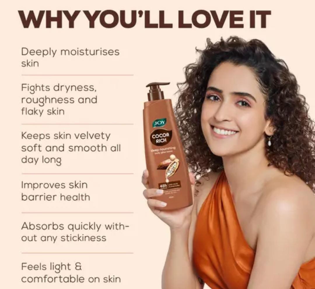 Indulge your skin with the luxurious care of Joy Cocoa Rich Body Lotion (400ml), a nourishing formula enriched with the goodness of natural cocoa butter. Specially designed for Indian skin types, this lotion provides intense hydration, long‑lasting softness, and protection against dryness, making it an ideal choice for winter care and year‑round nourishment.