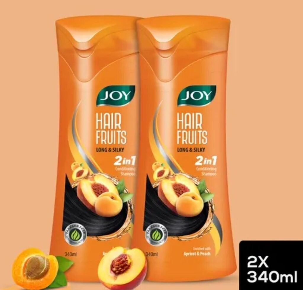 Two 340ml bottles of Joy Hair Fruits Long & Silky 2-in-1 Conditioning Shampoo.
