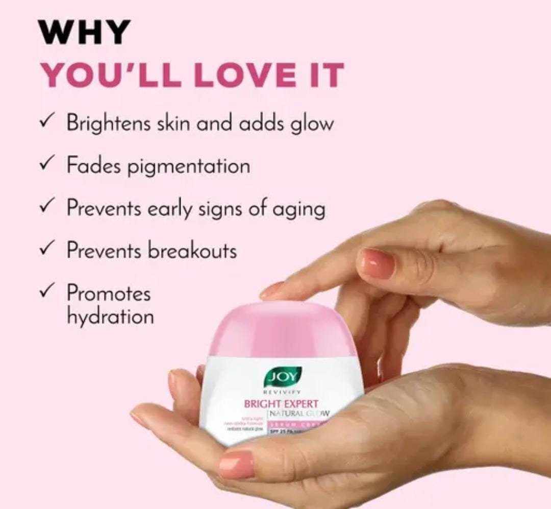 Reveal your skin’s natural radiance with the Joy Revivify Bright Expert Natural Glow Serum Cream SPF 25 PA+++ (50ml). This advanced serum-cream hybrid combines the nourishing benefits of a cream with the lightweight texture of a serum, delivering brightening care and sun protection in one.