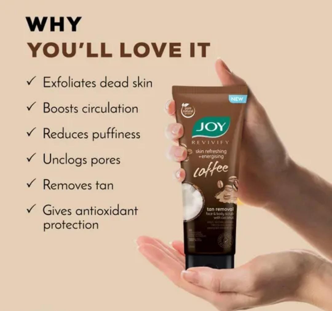 Wake up your skin with the energizing power of Joy Revivify Skin Refreshing + Energizing Coffee Tan Removal Face & Body Scrub (200ml). This dual-action scrub blends the exfoliating benefits of coffee with the nourishing richness of coconut, designed to remove tan, refresh skin, and restore natural glow.