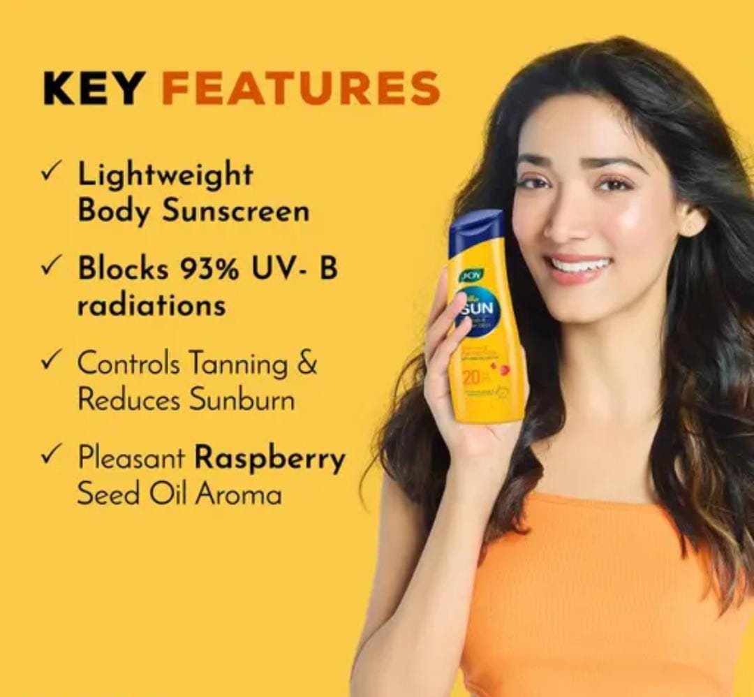Protect your skin from harmful sun exposure with Joy SPF 20 Face & Body Sunscreen (300ml), a lightweight and nourishing formula designed for everyday use. Enriched with natural moisturizers, this sunscreen provides broad spectrum protection against UVA and UVB rays, while keeping your skin hydrated, soft, and healthy. Perfect for Indian weather conditions, it ensures your skin stays shielded from tanning, sunburn, and premature aging.