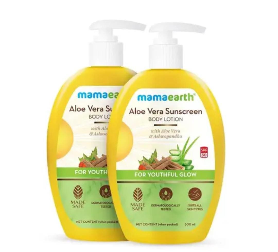 Protect and nourish your skin with Mamaearth Aloe Vera Sunscreen Body Lotion SPF 30 (300ml × Pack of 2), a lightweight yet powerful formula that combines broad-spectrum sun protection with deep hydration. Enriched with aloe vera and natural emollients, this lotion shields your skin from harmful UVA/UVB rays while keeping it soft, smooth, and refreshed all day long.