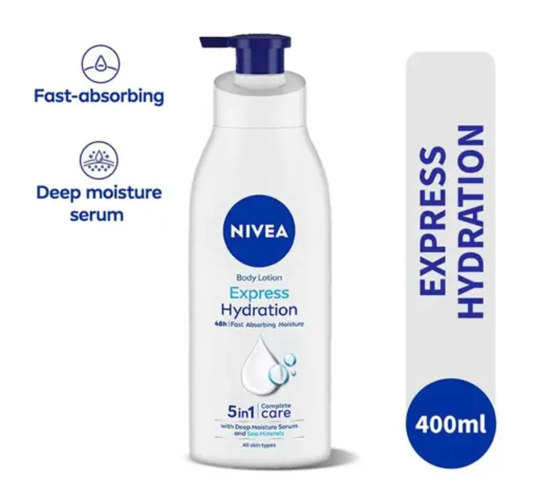 Keep your skin hydrated and refreshed all day with Nivea Express Hydration Body Lotion (400ml). Powered by Deep Moisture Serum and Sea Minerals, this lotion is designed to deliver instant absorption, long-lasting hydration, and silky smooth skin. Perfect for all skin types, it provides a lightweight, non-greasy formula that penetrates deep into the skin, ensuring softness and nourishment for up to 48 hours.