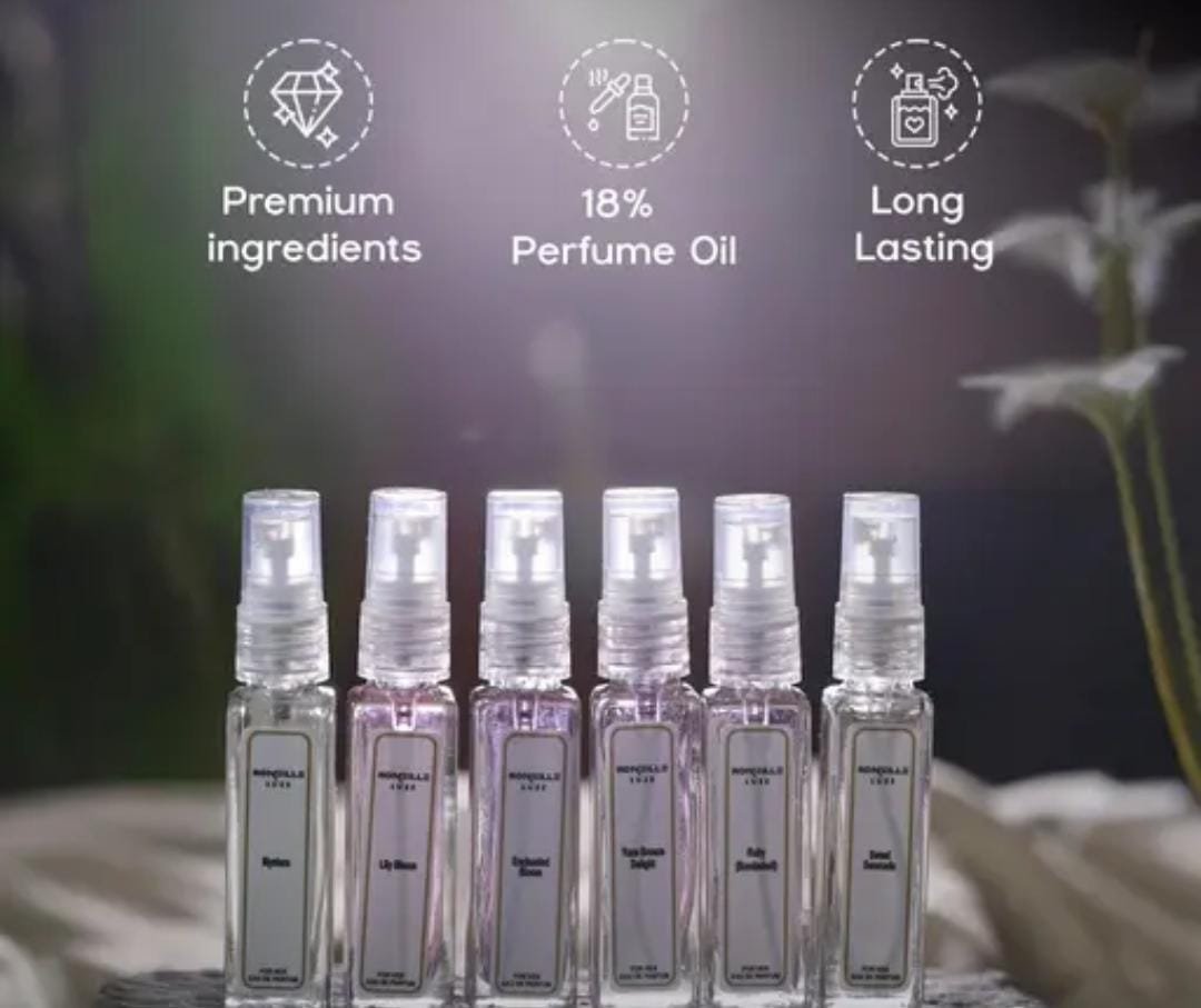 Presented in a luxury gift box, the set includes six 8ml premium glass bottles, elegantly designed for portability and style. Compact yet luxurious, this set is perfect for handbags, travel kits, or vanity displays.
