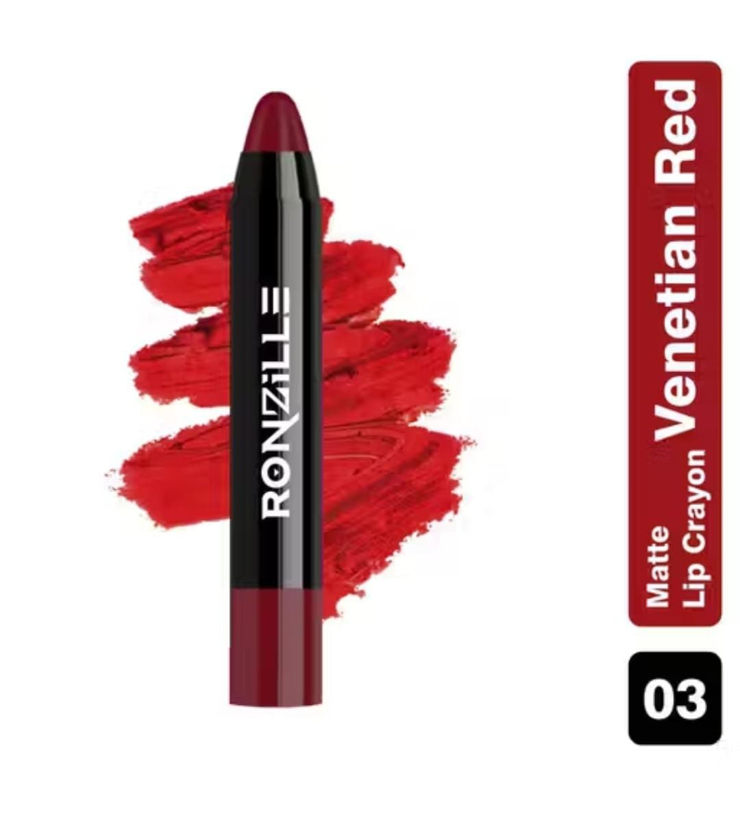 Channel timeless elegance with Ronzille Matte Long-Lasting Lip Crayon Lipstick – Shade 03 Venetian Red, a rich, earthy red that blends classic glamour with everyday wearability. Designed for women who love bold pigment and effortless application, this creamy matte crayon delivers full coverage, smooth glide, and all-day comfort in one sleek, twist-up format.