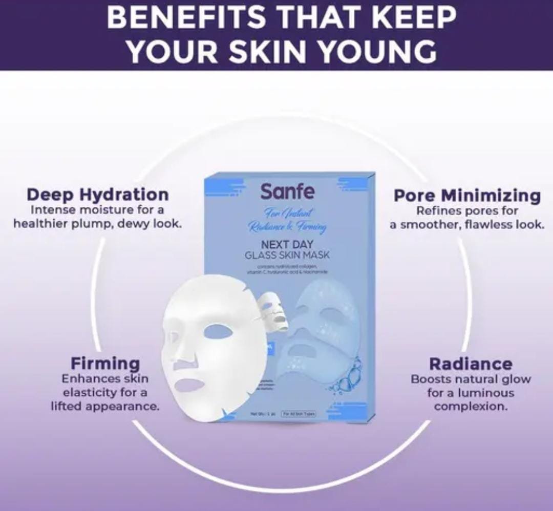 Wake up to radiant, glass-like skin with the Sanfe Next Day Glass Skin Mask (Overnight Sleep Mask). Inspired by Korean skincare rituals, this intensive overnight treatment is designed to deliver deep hydration, collagen boost, and skin repair while you sleep. Its lightweight gel-cream texture absorbs quickly, locking in moisture and nutrients for a plump, luminous complexion by morning.