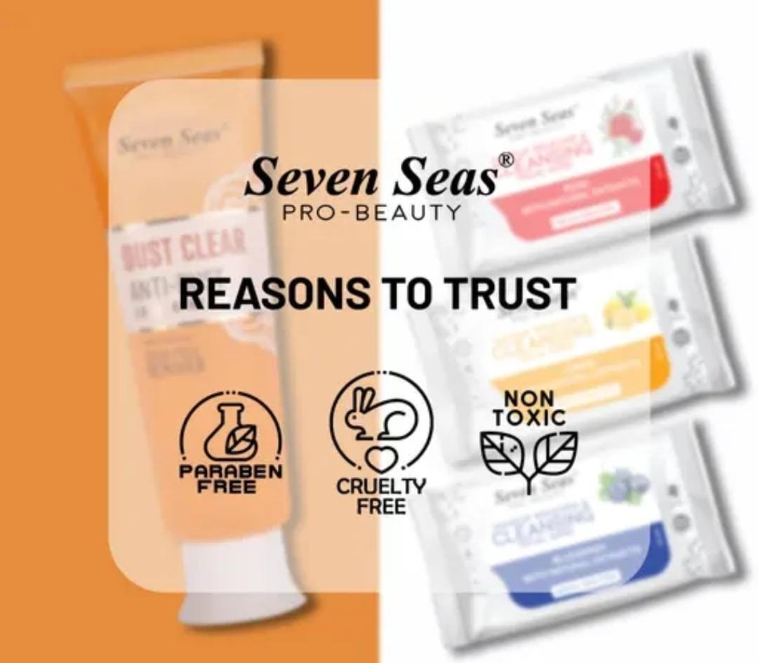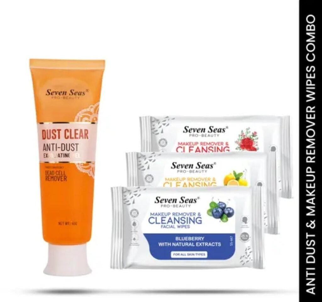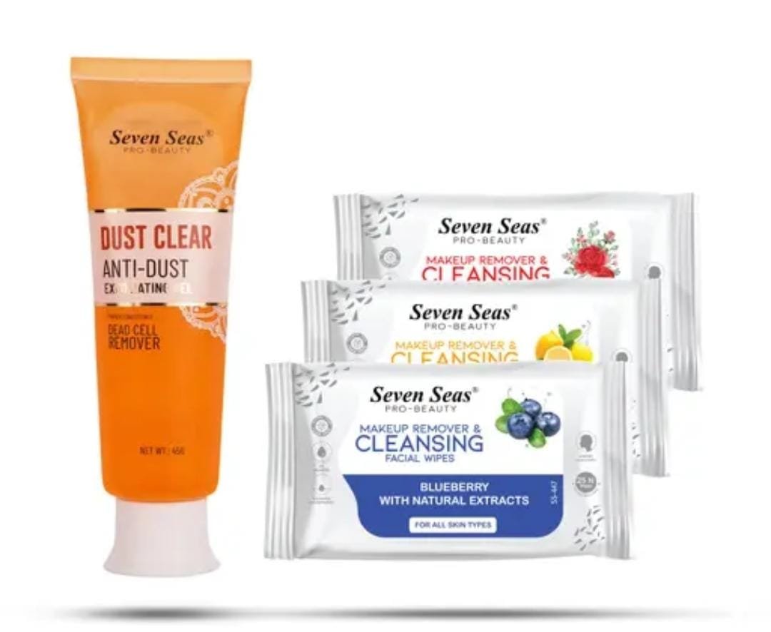 Get fresh, glowing skin and effortless makeup removal with the Seven Seas Dust Clear Anti-Dust Exfoliating Face Gel (45g) paired with the Seven Seas Makeup Remover & Cleansing Facial Wipes (Pack of 3). This combo is designed to cleanse away impurities, exfoliate dead cells, and remove makeup instantly, leaving your skin soft, refreshed, and radiant.