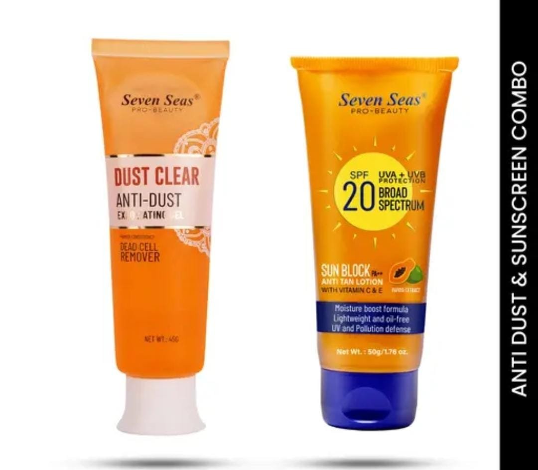 Protect and refresh your skin with the Seven Seas Dust Clear Anti-Dust Exfoliating Face Gel (45g) paired with the Seven Seas Sunscreen SPF 20 PA++ Anti-Tan Lotion (50g). This pack of 2 combo is designed to cleanse away impurities and shield your skin from harmful sun exposure, giving you a glowing, healthy complexion every day.