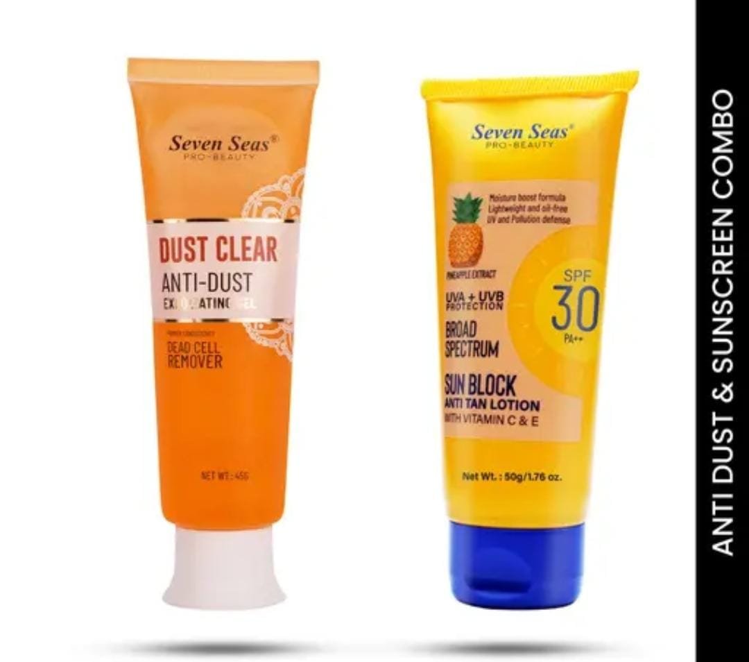 Give your skin the care it deserves with the Seven Seas Dust Clear Anti-Dust Exfoliating Face Gel (45g) paired with the Seven Seas Sunscreen SPF 30 PA++ Anti-Tan Lotion (50g). This pack of 2 combo is designed to cleanse away impurities and shield your skin from harmful sun exposure, ensuring a glowing, healthy complexion every day.