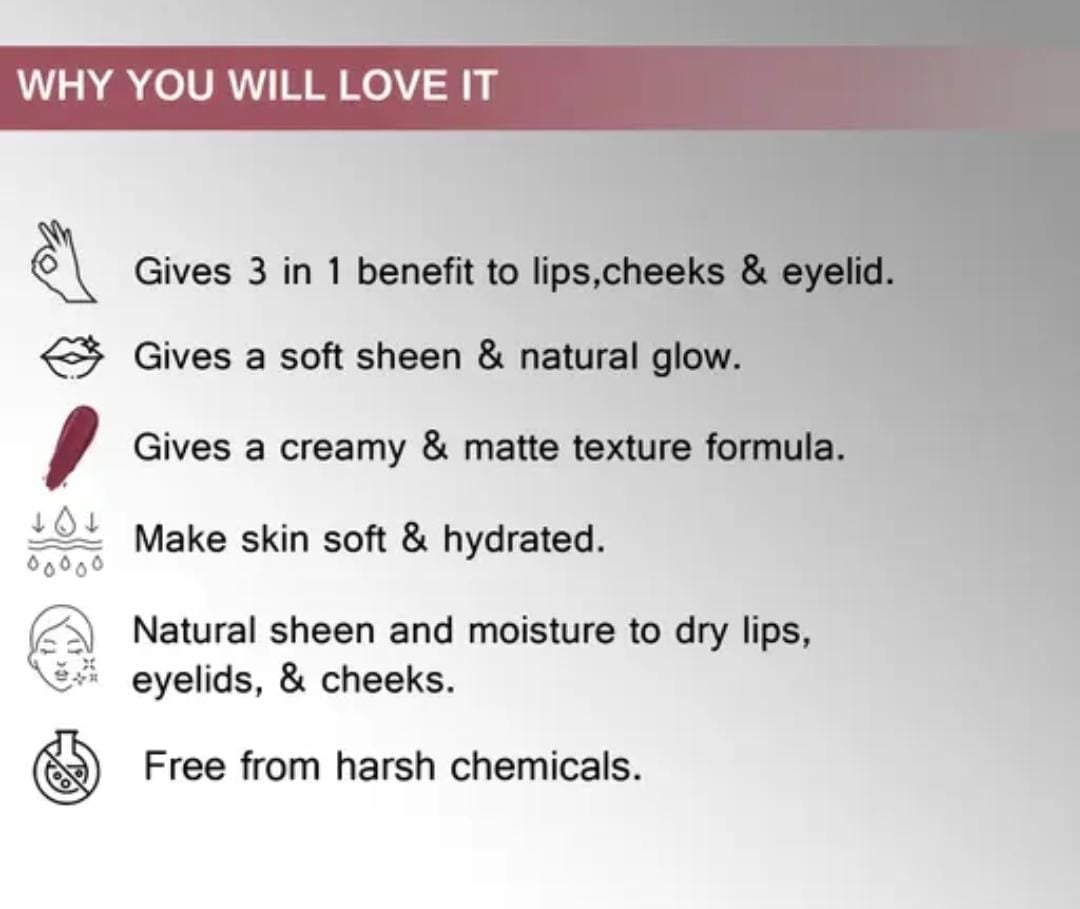 – Multi-Use Formula: Perfect for lips, cheeks, and eyes.
