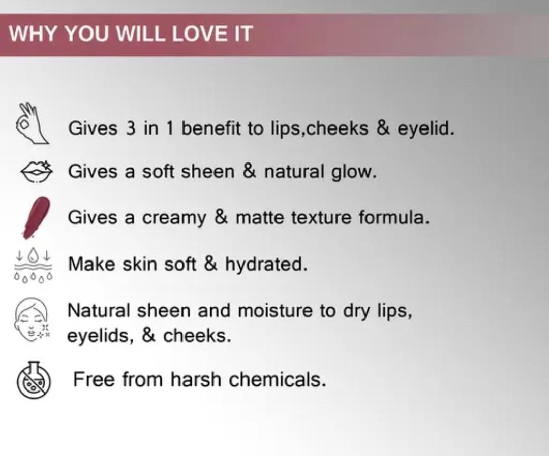 – Multi-Use Formula: Perfect for lips, cheeks, and eyes.