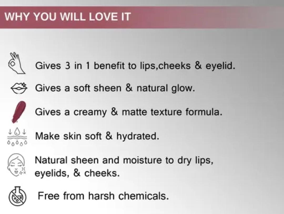 – Multi-Use Formula: Perfect for lips, cheeks, and eyes.