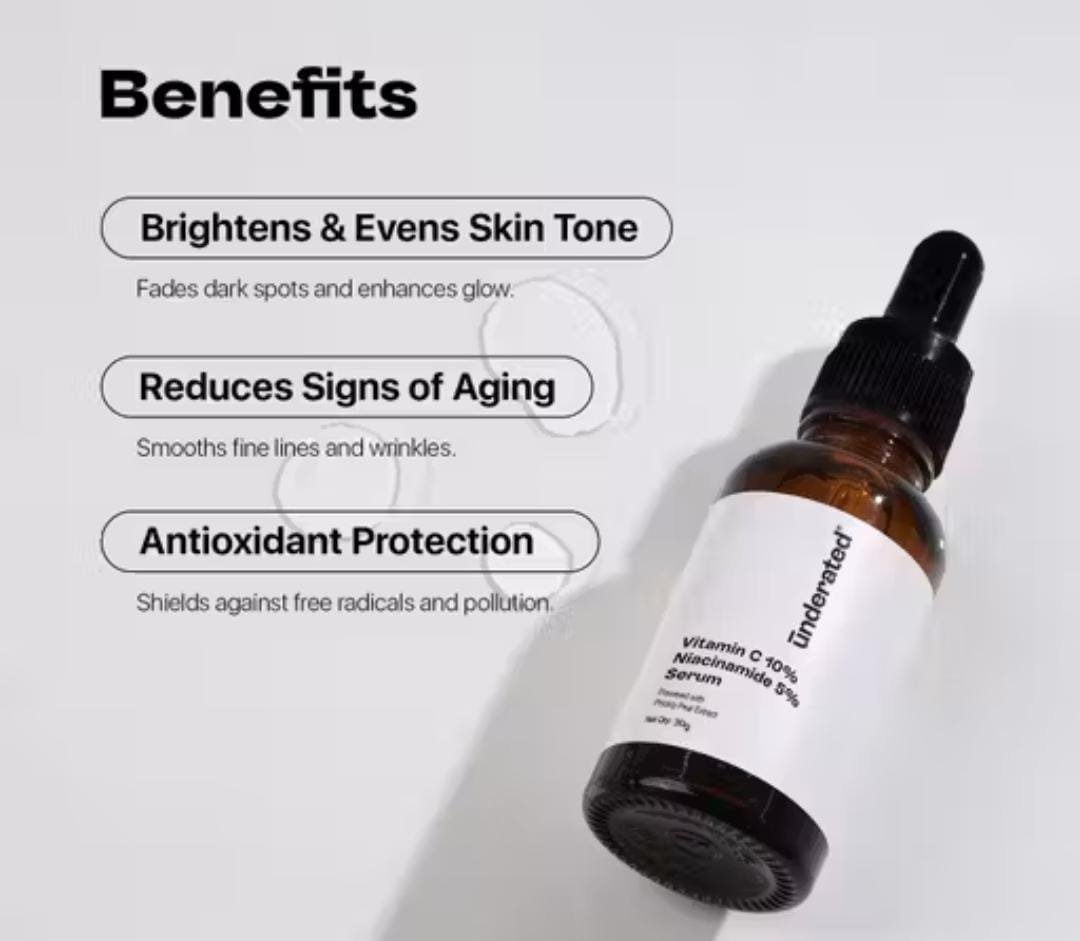 Glow brighter and fight dullness with the Underated 10% Vitamin C + 5% Niacinamide Serum, a potent yet balanced formula designed to visibly improve skin tone, texture, and radiance. With stabilized Vitamin C and calming Niacinamide, this serum delivers antioxidant defense and complexion correction—ideal for daily use across all skin types.