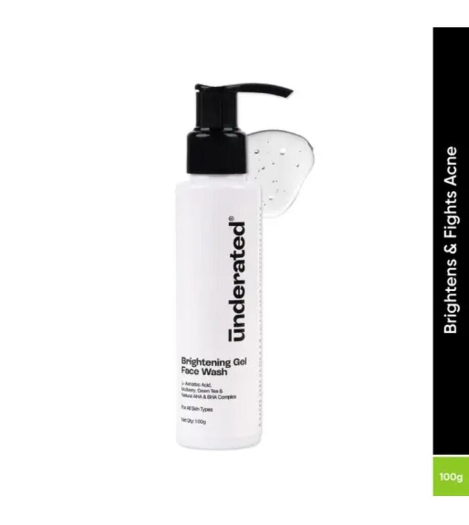Reveal luminous, healthy skin with the Underated Brightening Gel Face Wash (100g). This advanced gel-based cleanser is powered by Vitamin C (L-Ascorbic Acid), mulberry extracts, green tea, and a natural AHA-BHA complex, working together to brighten, exfoliate, and purify your skin. Designed for all skin types, it gently removes impurities, reduces dullness, and restores a radiant glow without harsh chemicals.