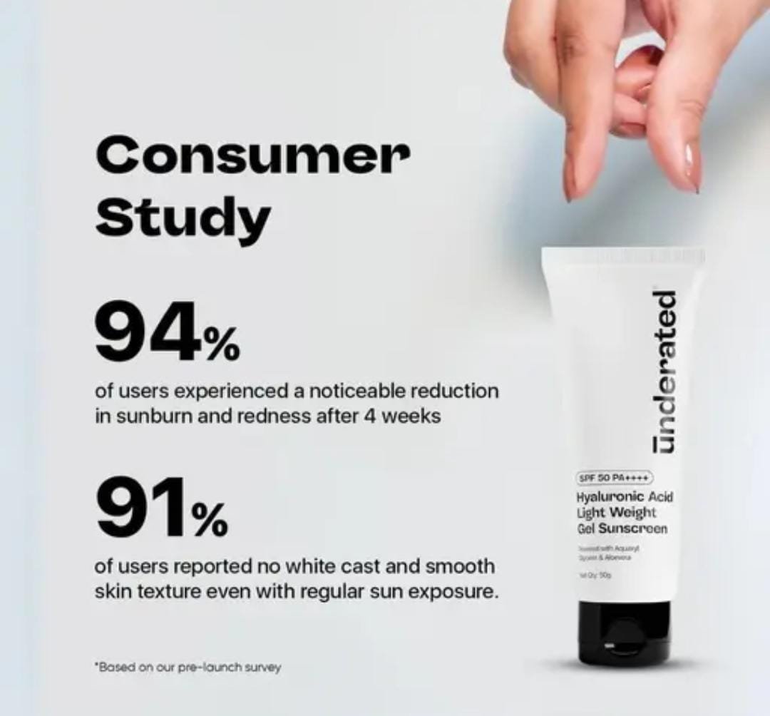 Protect and hydrate your skin with Underated Hyaluronic Acid Lightweight Gel Sunscreen SPF 50 PA++++ (50g), a modern skincare essential designed for all skin types. This advanced gel sunscreen offers broad-spectrum UVA/UVB protection, ensuring maximum defense against sunburn, tanning, and premature aging.