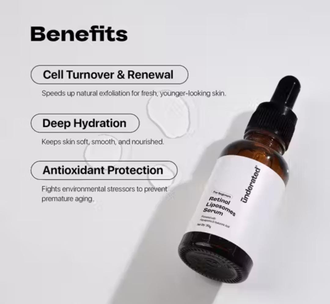 Refine, renew, and restore with the Underated Retinol Liposomes Serum, a next-generation formula that delivers retinol through encapsulated liposomes for enhanced stability and reduced irritation. Designed to smooth fine lines, improve texture, and boost skin clarity, this serum offers powerful results with a gentle touch—ideal for beginners and sensitive skin.
