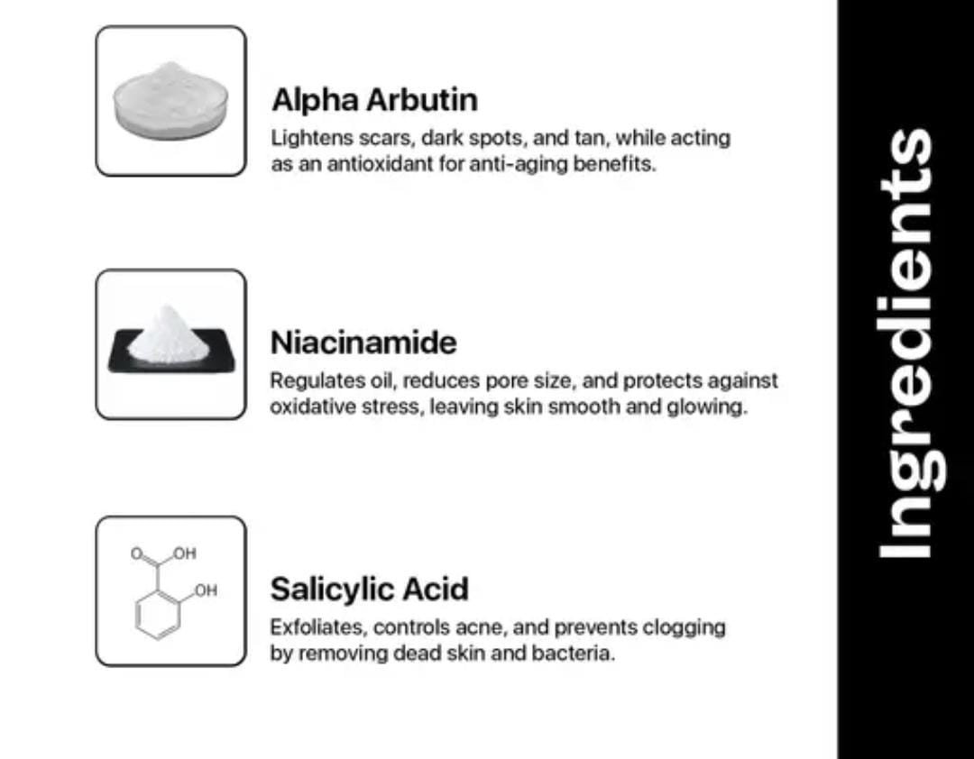 – Salicylic Acid: A powerful BHA that penetrates pores, dissolves excess oil, and prevents acne and blackheads.