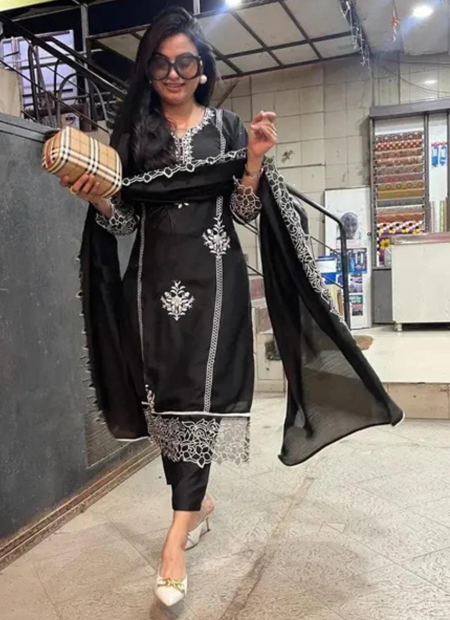 In conclusion, this kurta set is more than just clothing. It is a statement of confidence, elegance, and cultural connection. With its premium fabric, flattering silhouette, and versatile styling options, the women black floral notch neck kurta with dupatta and bottomwear, cotton blend fabric, straight kurta, pants, embroidered lace detailing, three quarter sleeves, calf length design is a must-have for every wardrobe.