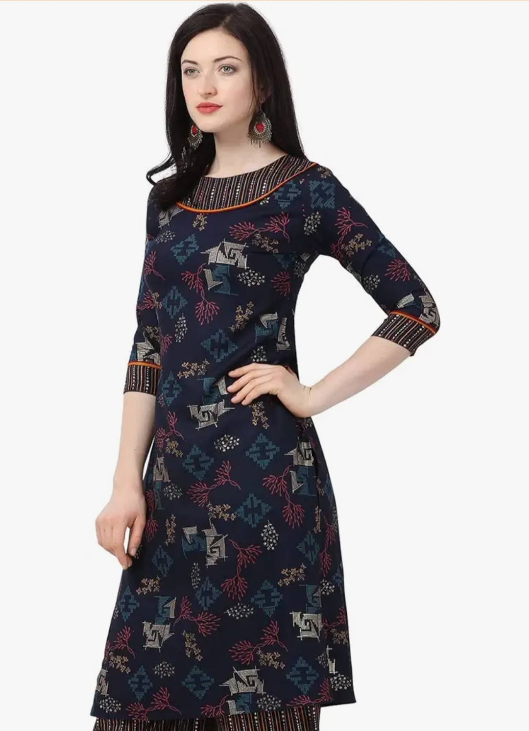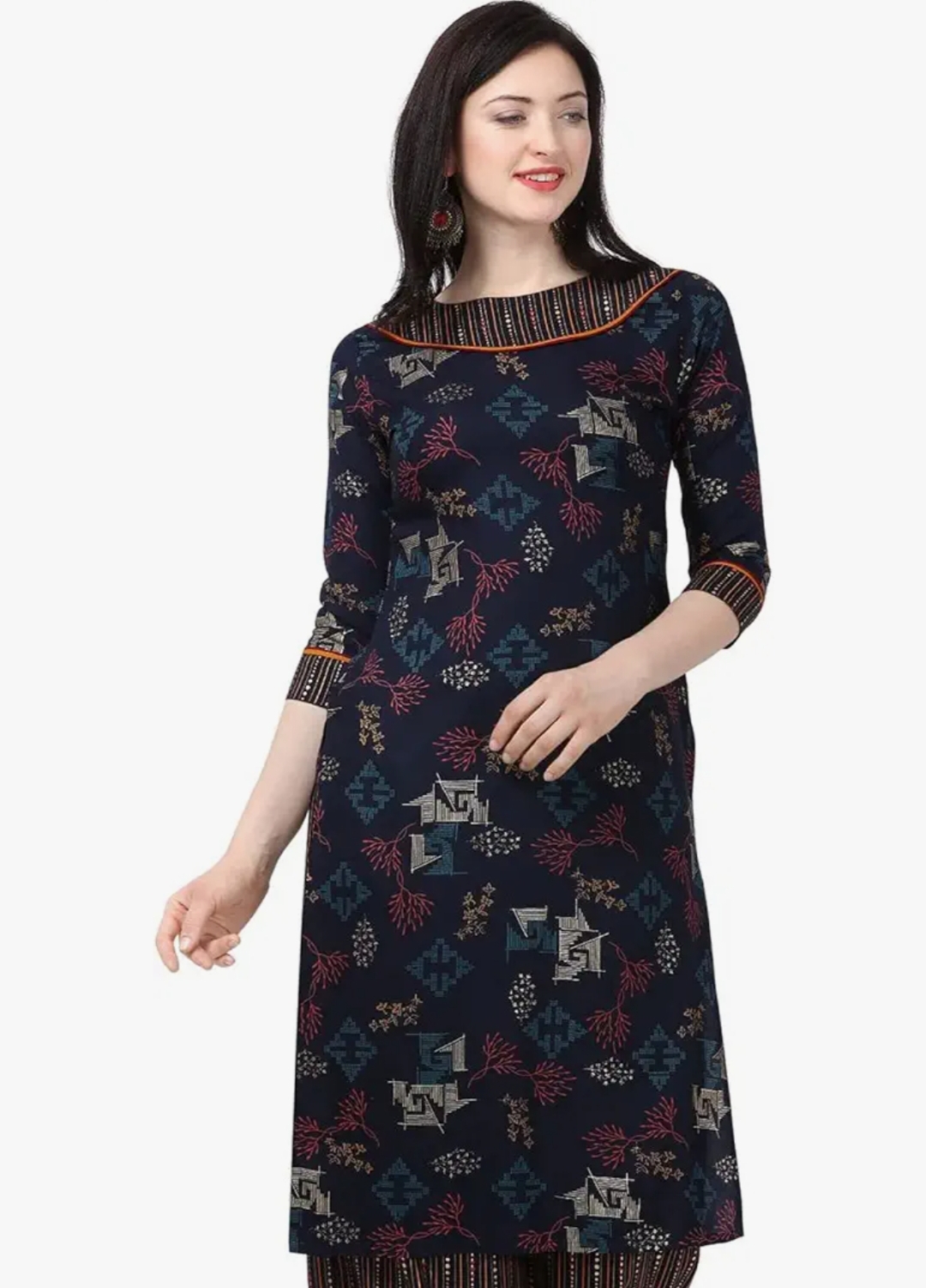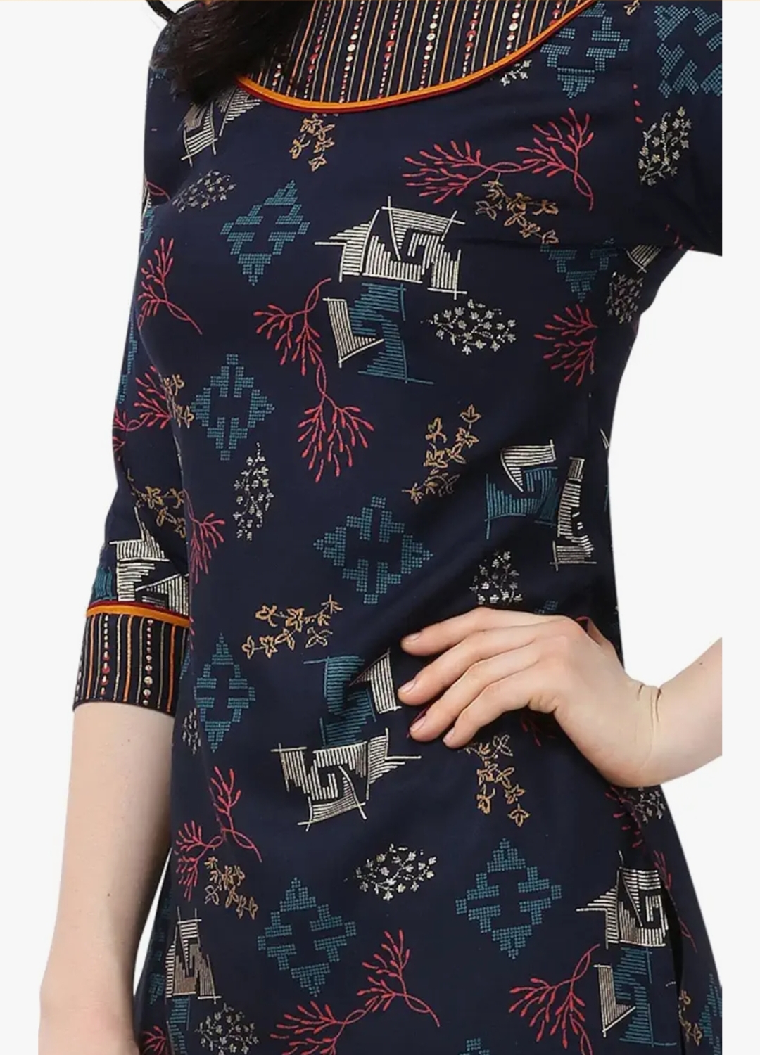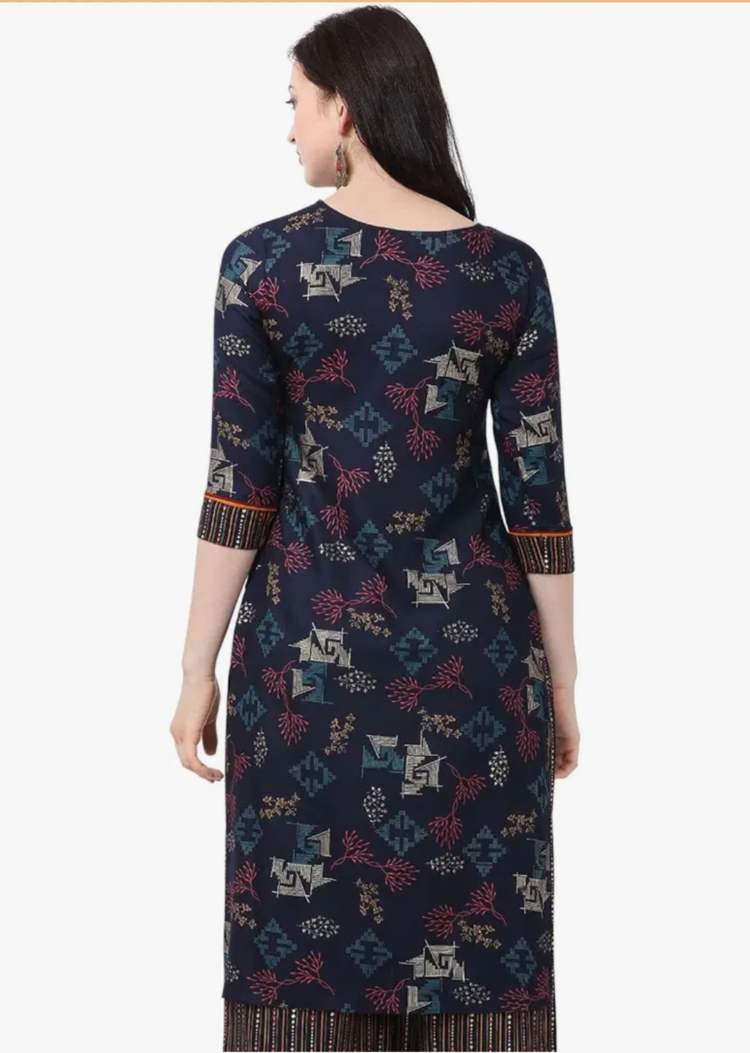Designed with three-quarter sleeves, the kurta offers a balanced combination of style and practicality. The sleeves provide comfortable coverage while maintaining a modern ethnic appearance. With a 42-inch calf-length design, this kurta pairs beautifully with leggings, palazzos, straight pants, or even denim for a fusion look.