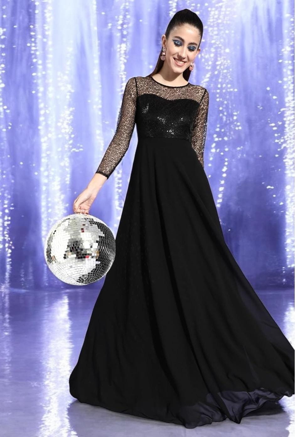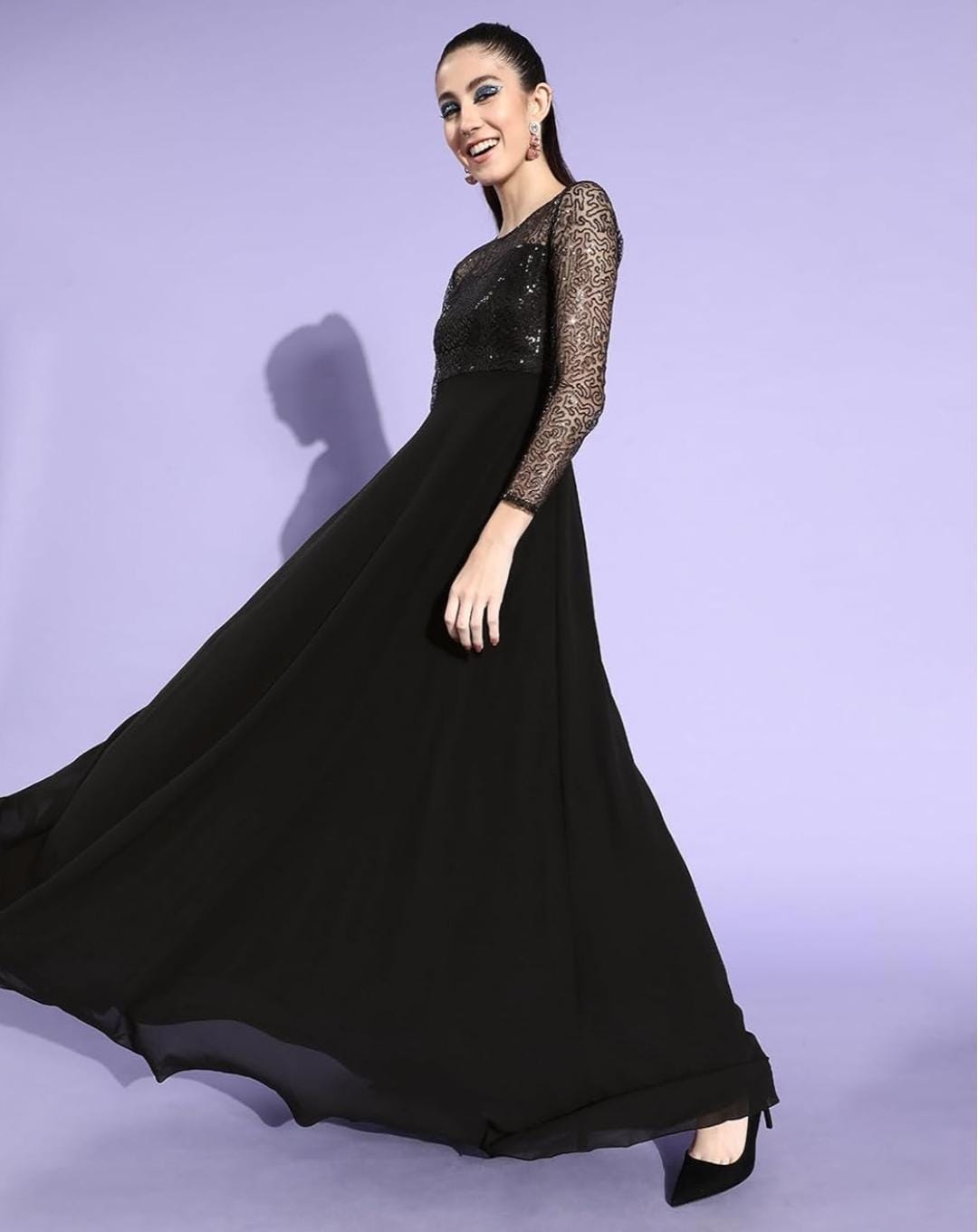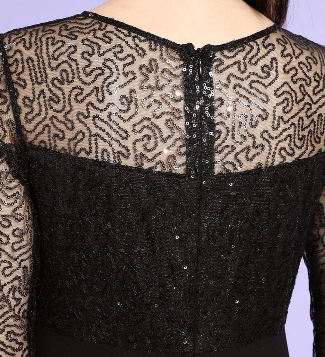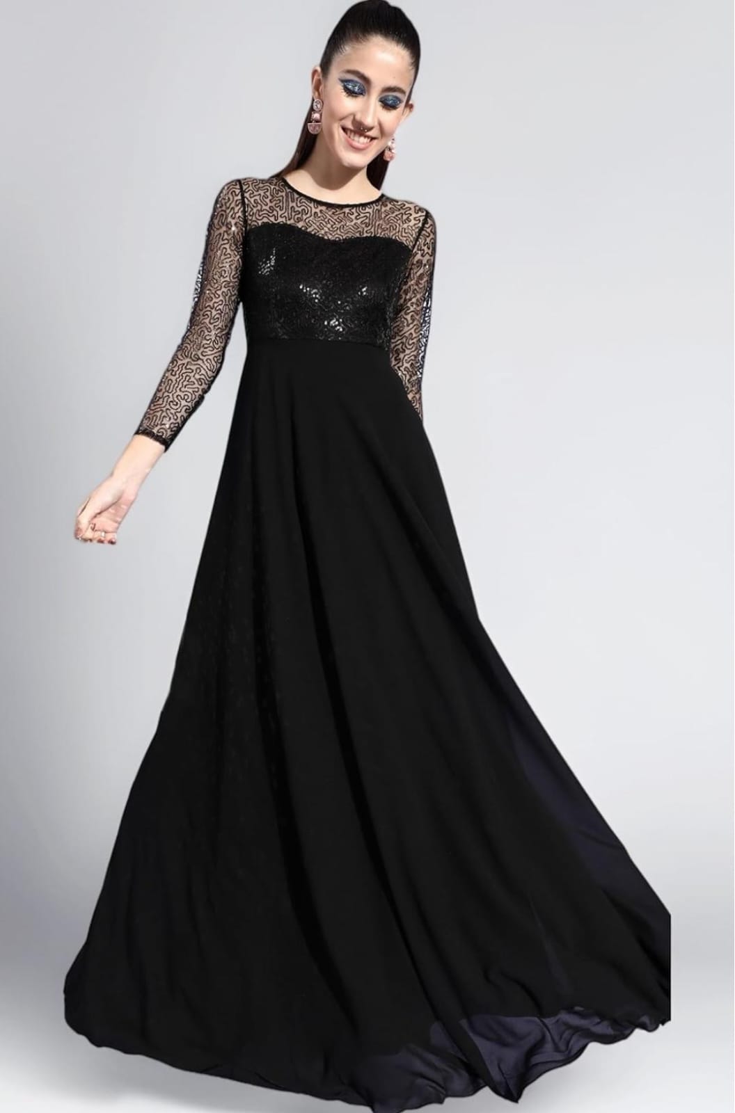 Crafted from lightweight georgette fabric with a soft polyester inner lining, this dress offers both comfort and graceful movement. The sheer full sleeves with delicate sequin patterns create a refined and stylish look while maintaining an elegant balance between glamour and sophistication.