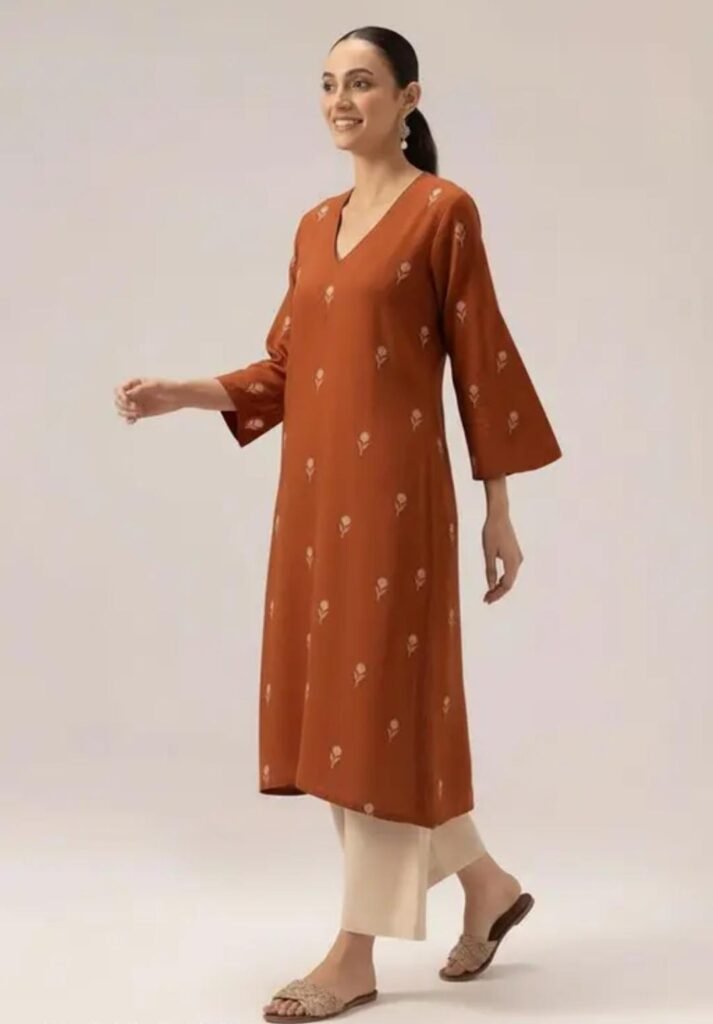 The kurta features a straight silhouette with a calf-length design. The v neck adds sophistication, while the brown printed fabric enhances its ethnic appeal. The three quarter sleeves provide balanced coverage, making the outfit suitable for different seasons.
