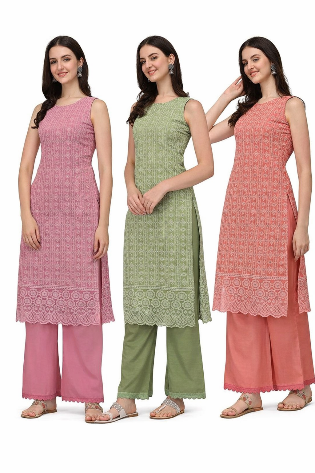 Available in three beautiful colors — Pink, Green, and Coral Orange — this chikankari kurta palazzo set complements different style preferences while maintaining a timeless ethnic appeal.