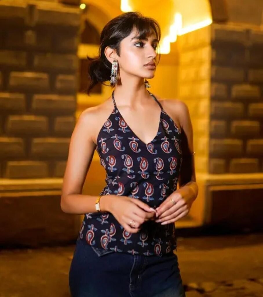 The kurti features a v neck design with a sleeveless cut, adding a modern edge. The short length makes it versatile, while the backless style adds uniqueness and boldness. The printed detailing enhances its appeal, giving it a vibrant and chic look.