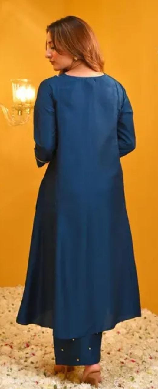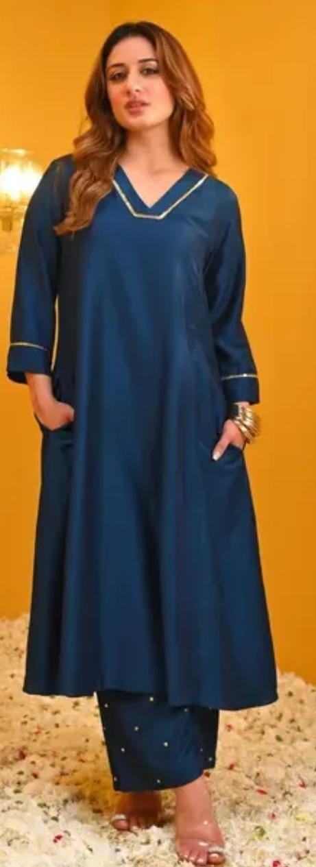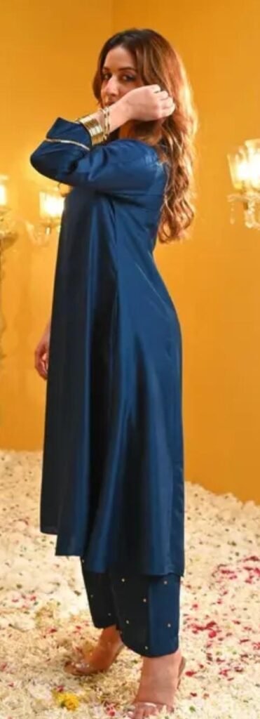 The dark blue color of the kurta set symbolizes sophistication, confidence, and grace. Combined with the v neck and A-line silhouette, the outfit exudes charm and individuality. Whether it is a festive celebration, a family function, or a casual day out, this kurta set ensures you look stylish and confident.