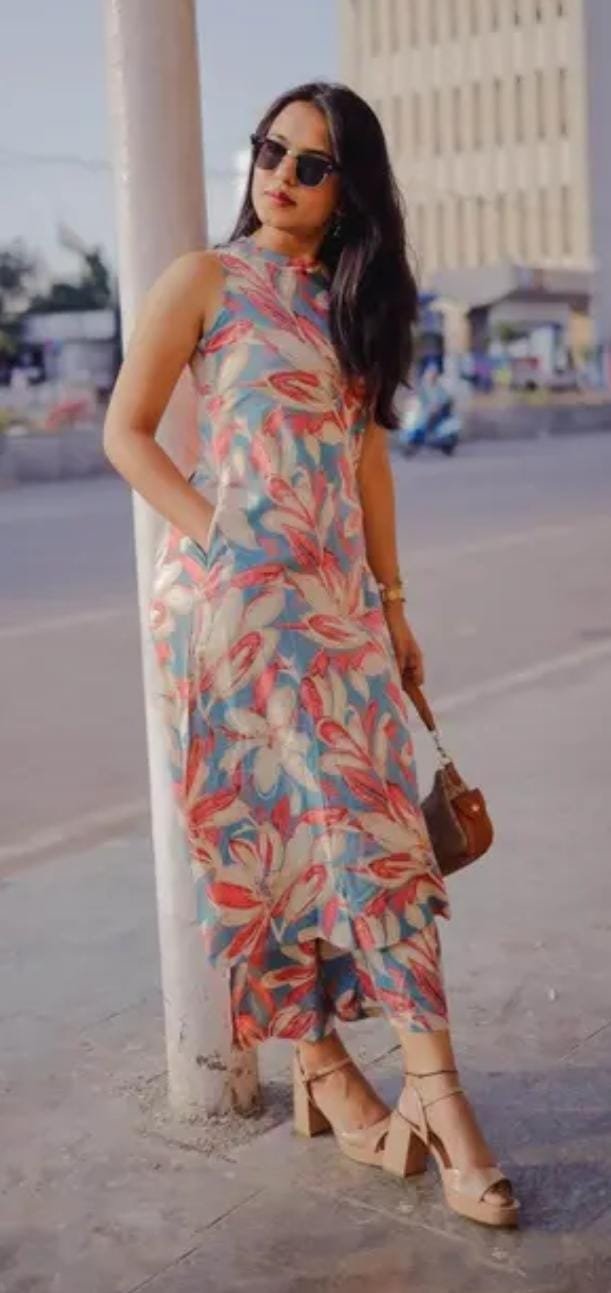 In conclusion, this kurta set is more than just clothing. It is a statement of confidence, elegance, and individuality. With its premium fabric, flattering silhouette, and versatile styling options, the women floral multicolour kurti with bottomwear, halter neck, sleeveless, pocket detail, palazzo, rayon fabric, calf length design is a must-have for every wardrobe.