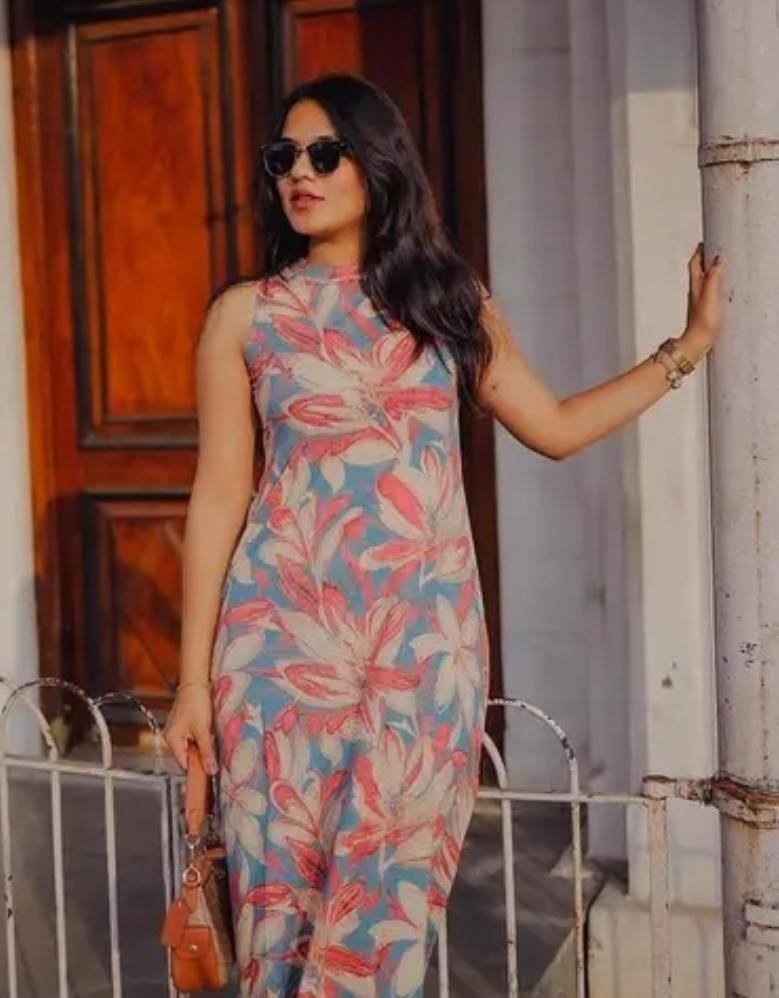The multicolour floral design symbolizes vibrancy, joy, and confidence. Combined with the halter neck and sleeveless cut, the outfit exudes charm and individuality. Whether it is a festive celebration, a family function, or a casual day out, this kurta set ensures you look stylish and confident.